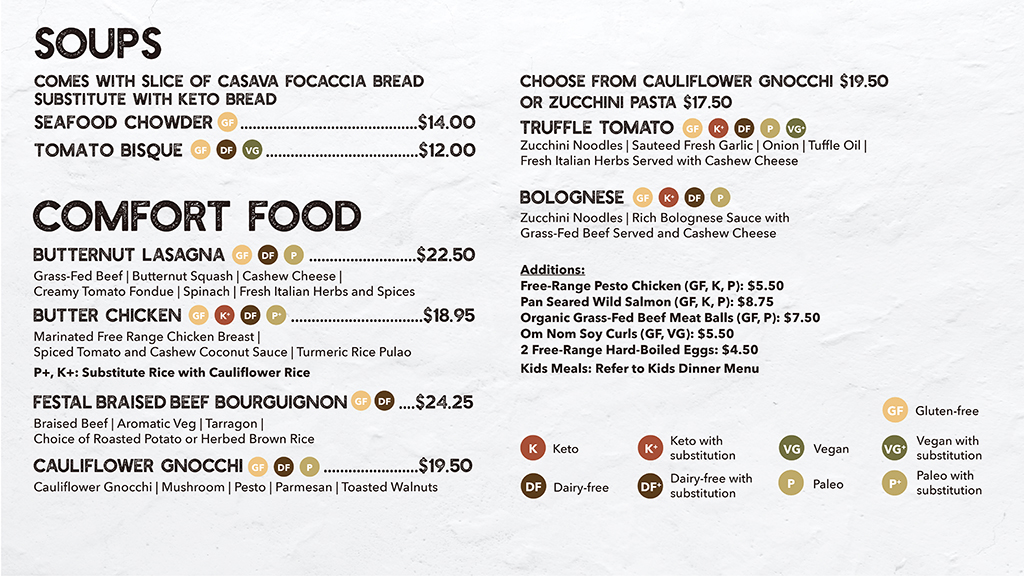Additions:Free-range pesto chicken (GF, K, P): $5.50